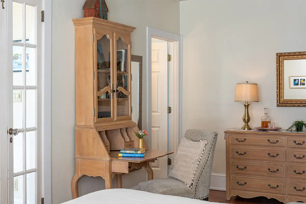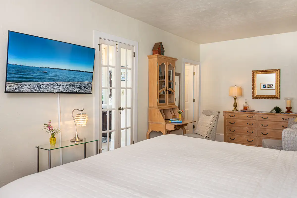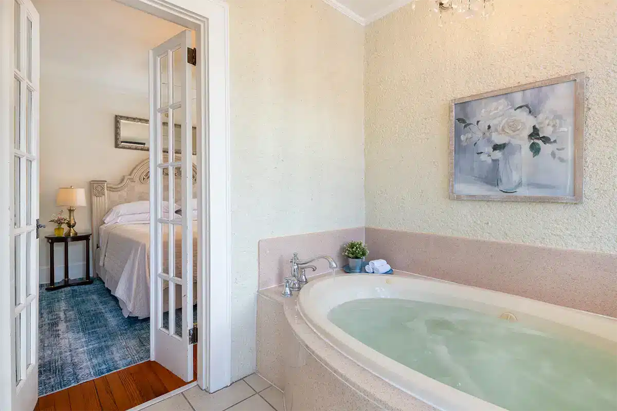 Cordova brings understated elegance to the second floor of Casa de Suenos. This unique room features a unusual massive white wood and marble King Bed and French doors that open to an oversized, two-person garden whirlpool tub, a walk-in shower, and a vanity sink. For extra convenience, you’ll find a second sink and toilet in a separate space. Step outside to a spacious, secluded east-facing balcony with views over Cordova Street, where you can watch the horse-drawn carriages roll by or listen in to the city guides who share stories of events, both real and fabricated, about the history, the geography, and the spirits of St. Augustine.