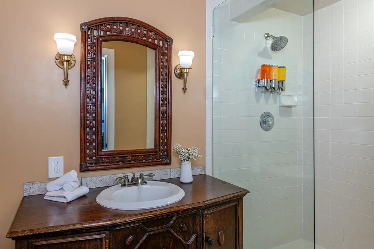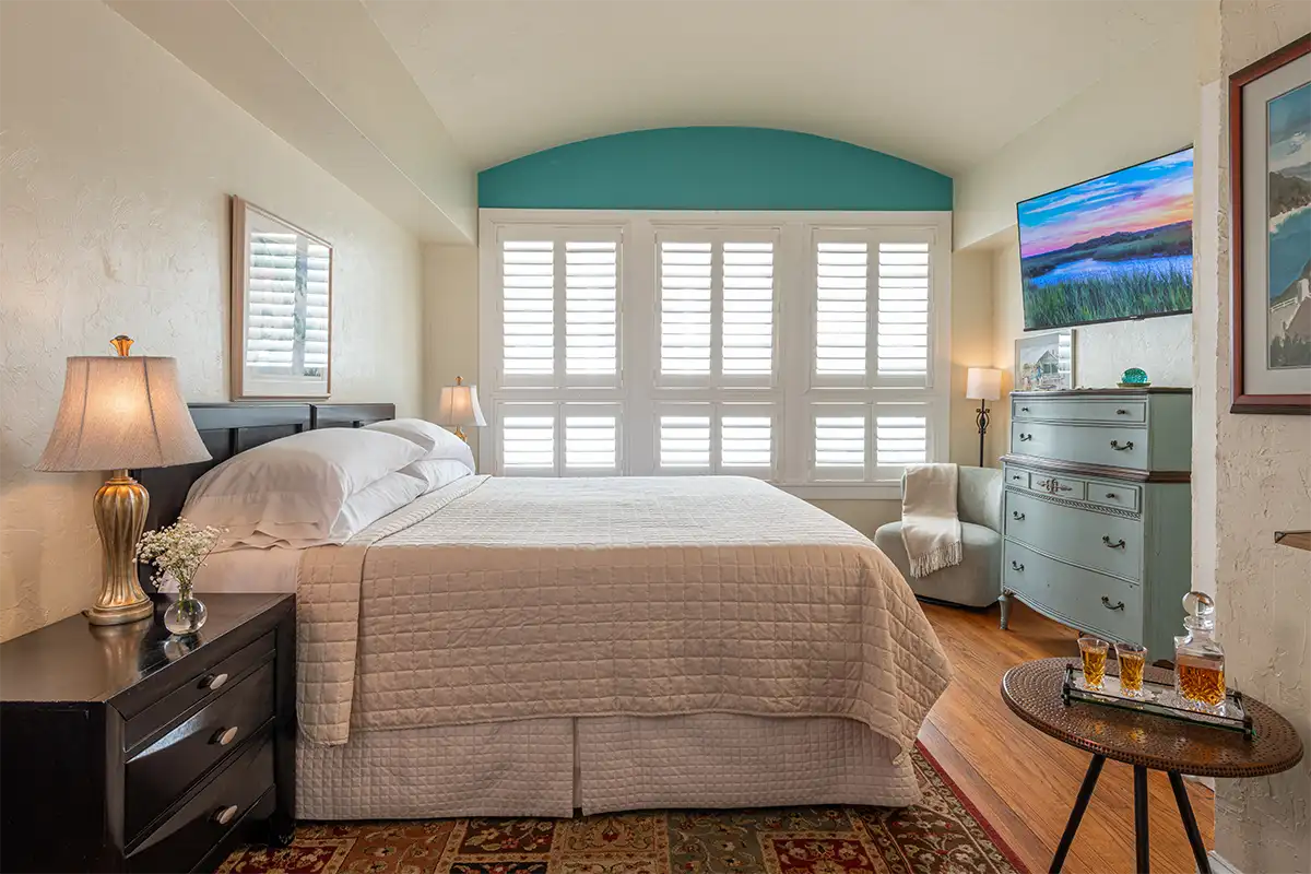 Granada is a bright, inviting room on the first floor of our B&B, located in downtown Saint Augustine. Featuring a king bed, French doors, and a vaulted barrel ceiling, this room feels open and welcoming. Bermuda shutters filter the sunshine, while comfortable, eclectic furnishings and a mini fridge add to your experience. The private bath includes a walk-in tiled shower and a beautiful dresser-style vanity.