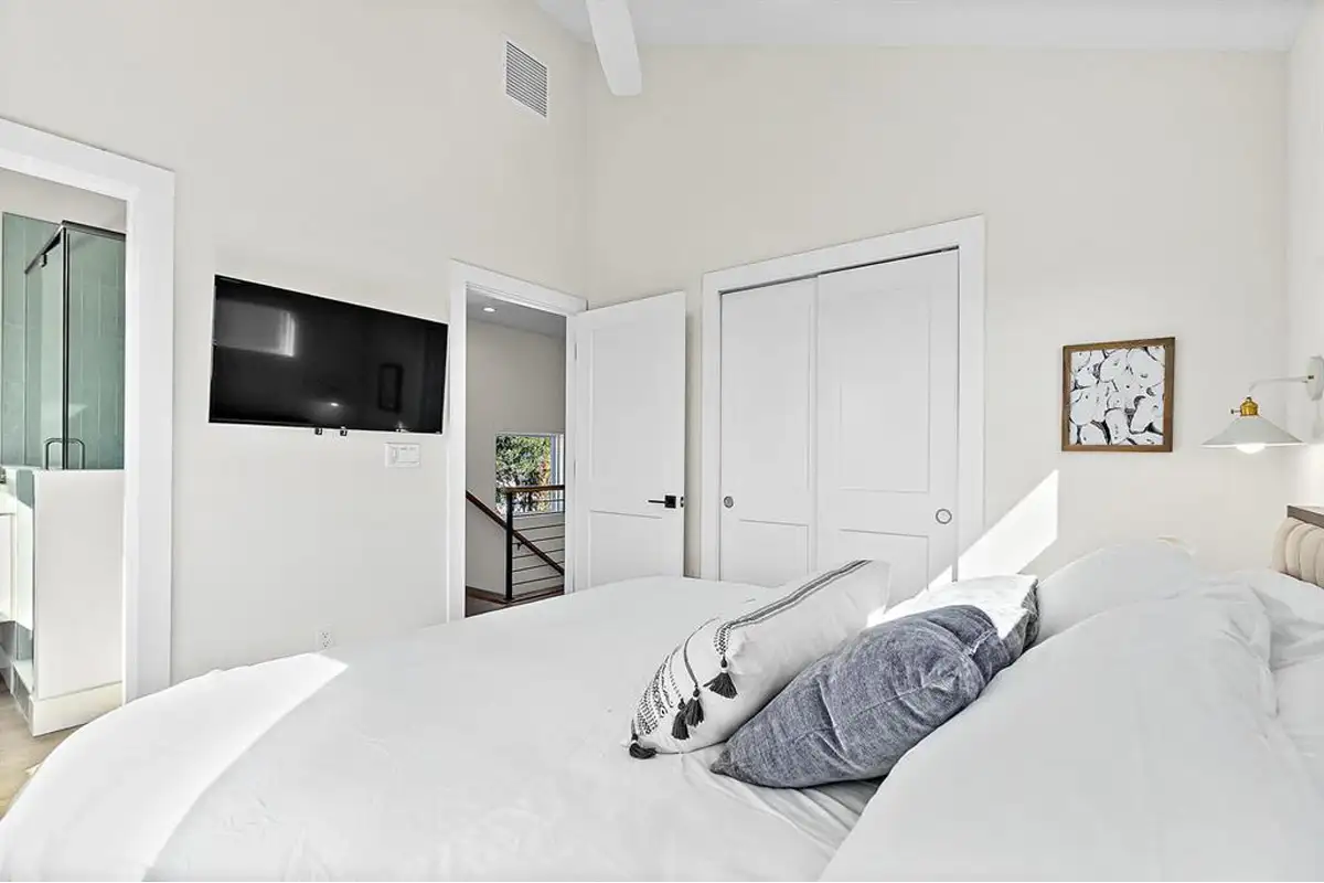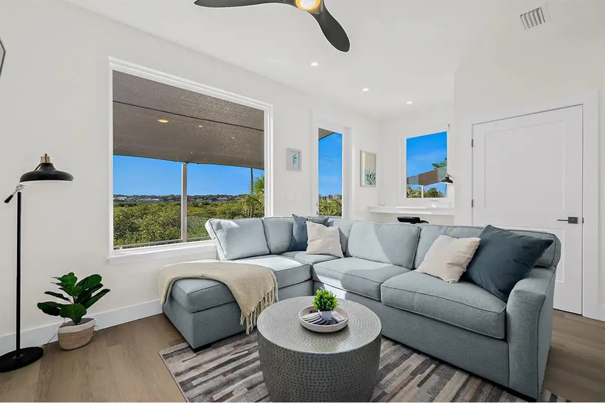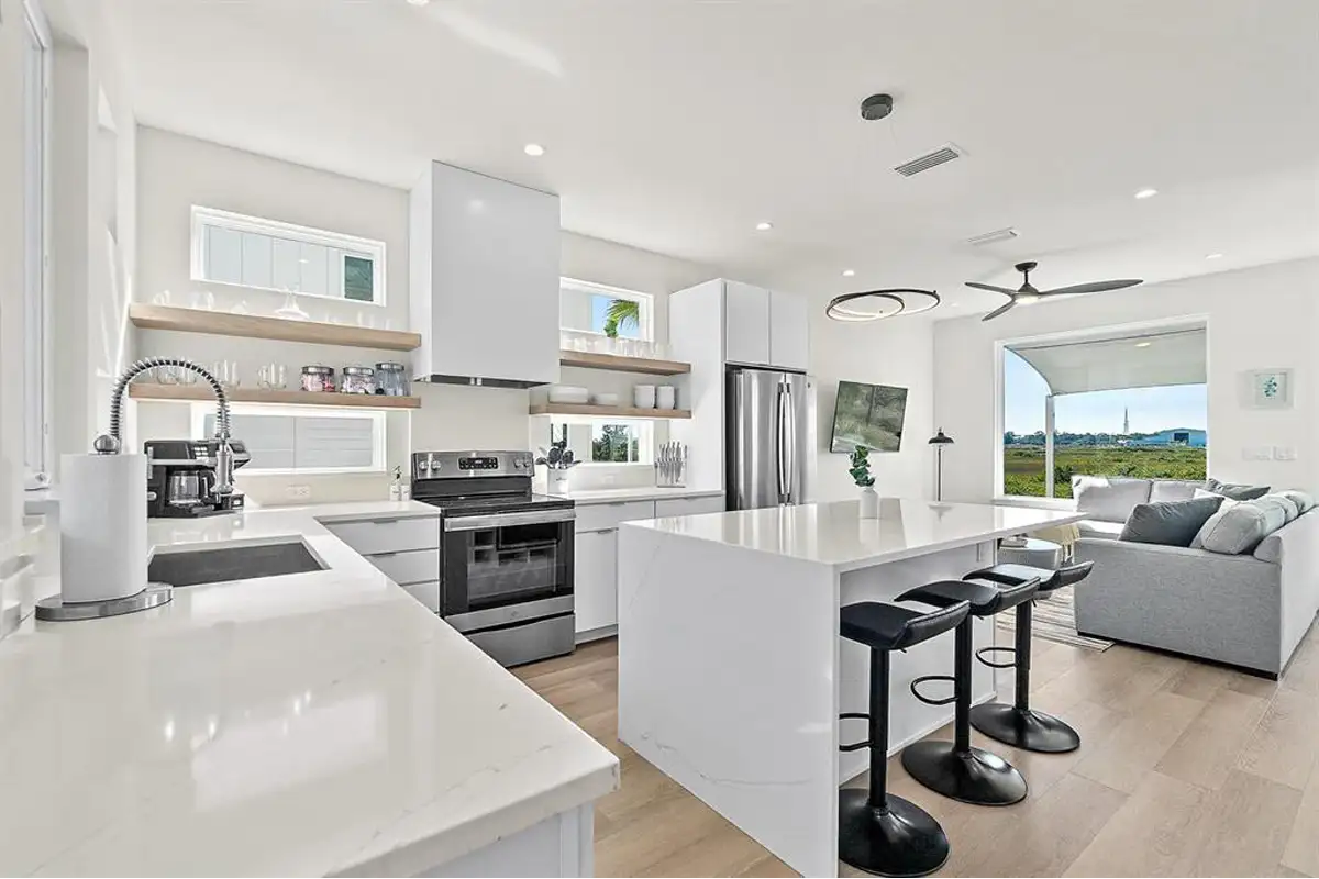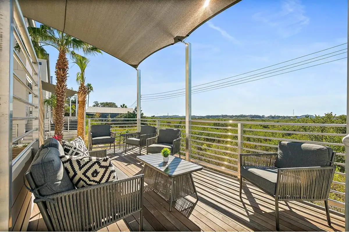 194 Riberia Street is located in the historic Lincolnville neighborhood. This unique luxury home, perched along the tidal marshes of Oyster Creek and the San Sebastian River, is just steps from St. Augustine’s historic district. It features a gourmet kitchen, an open living area with a large Smart TV (Hulu Live TV included), a handy workspace, a half bath on the first floor, two king bedrooms on the 2nd floor, each with a full bath, and a sofa bed to accommodate additional guests.