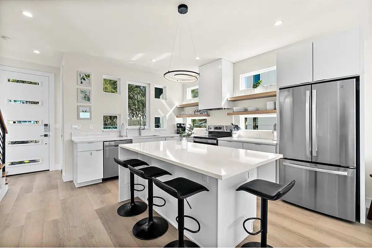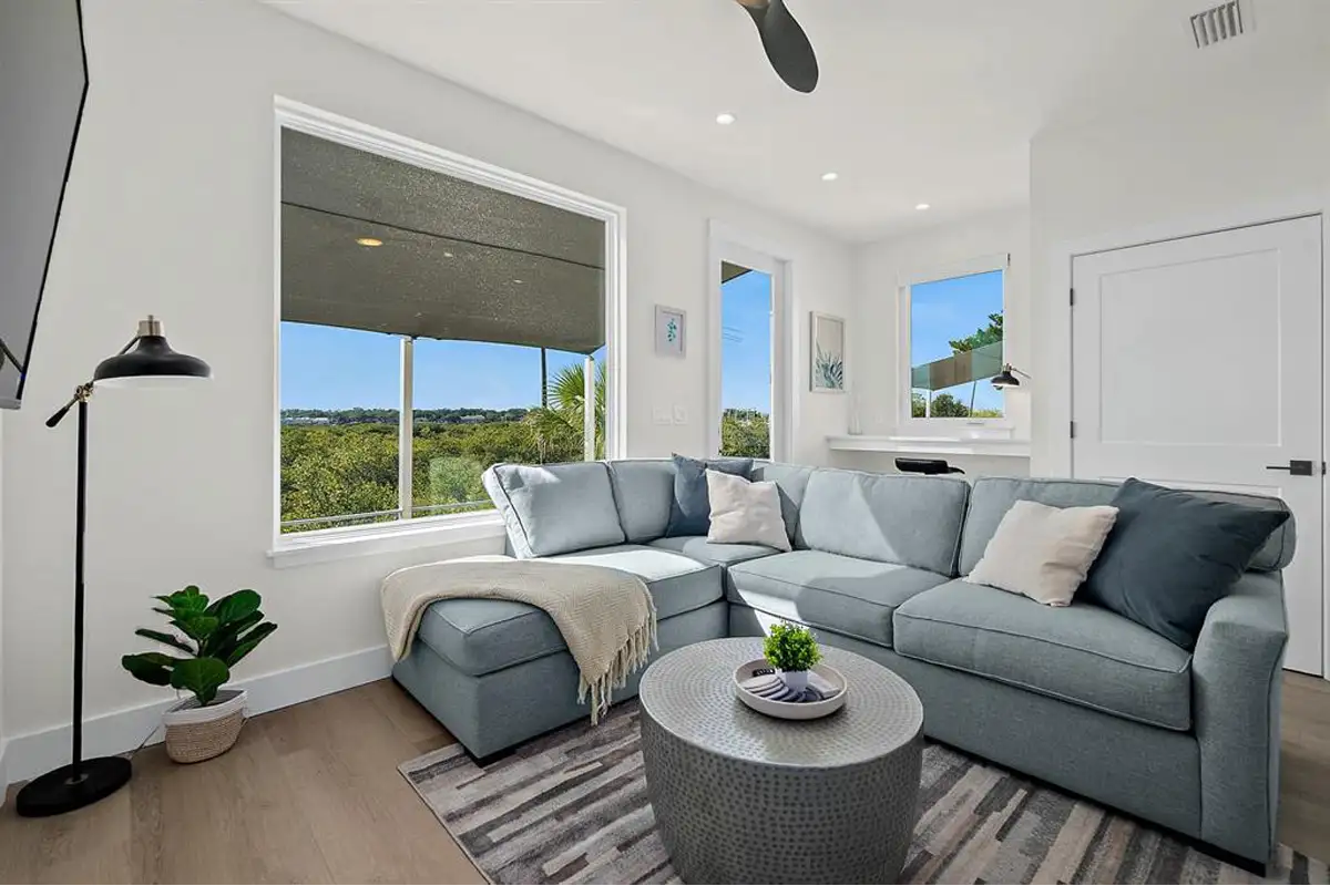 200 Riberia Street is located in the historic Lincolnville neighborhood. This unique luxury home, perched along the tidal marshes of Oyster Creek and the San Sebastian River, is just steps from St. Augustine’s historic district. It features a gourmet kitchen, an open living area with a large Smart TV (Hulu Live TV included), a handy workspace, a half bath on the first floor, two king bedrooms on the 2nd floor, each with a full bath, and a sofa bed to accommodate additional guests.